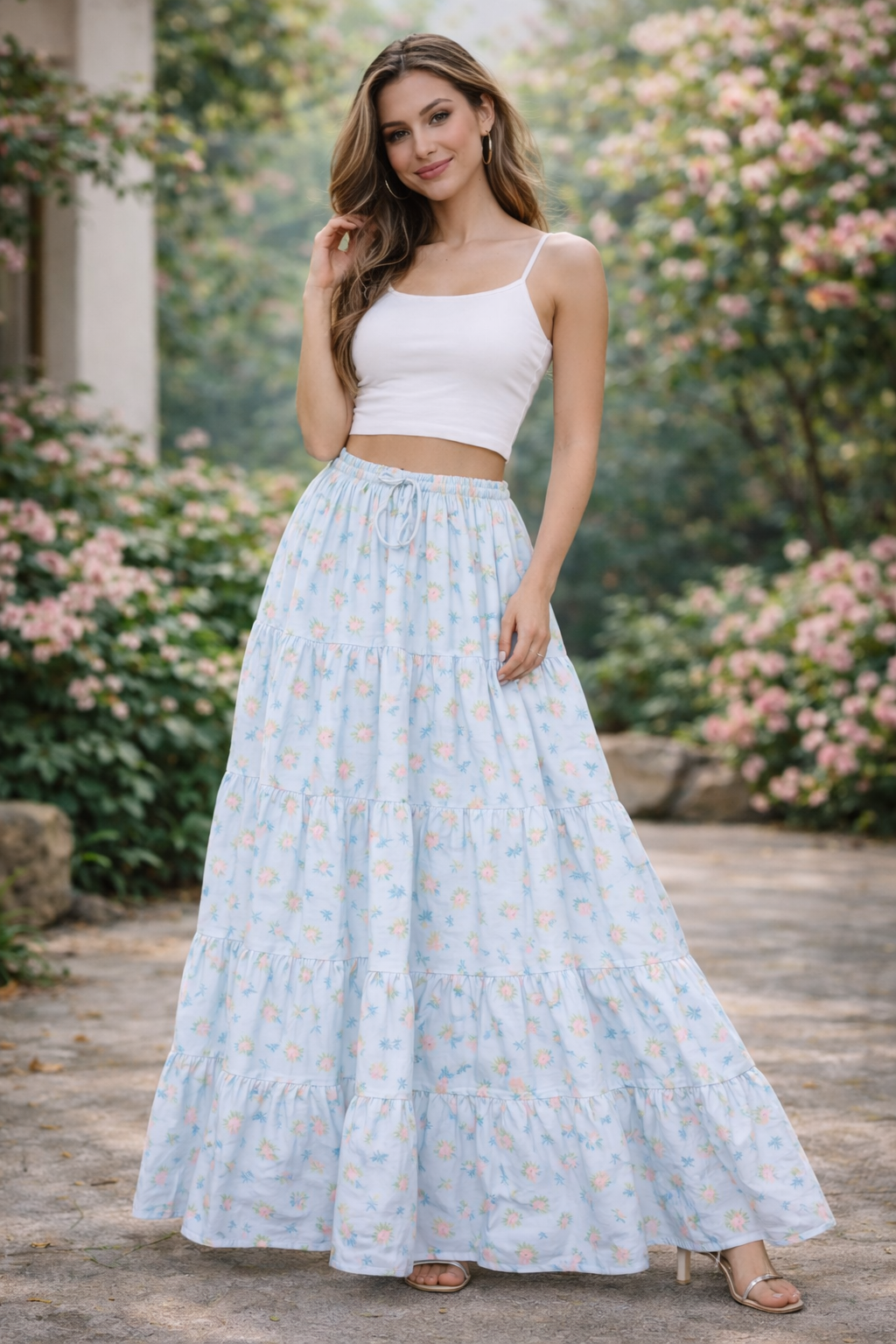 Soft and elegant, this pastel blue floral tiered maxi skirt features a flowing silhouette with an elastic waist for a comfortable free-size fit. Lightweight and breathable, it’s perfect for everyday wear, vacations, and summer styling.